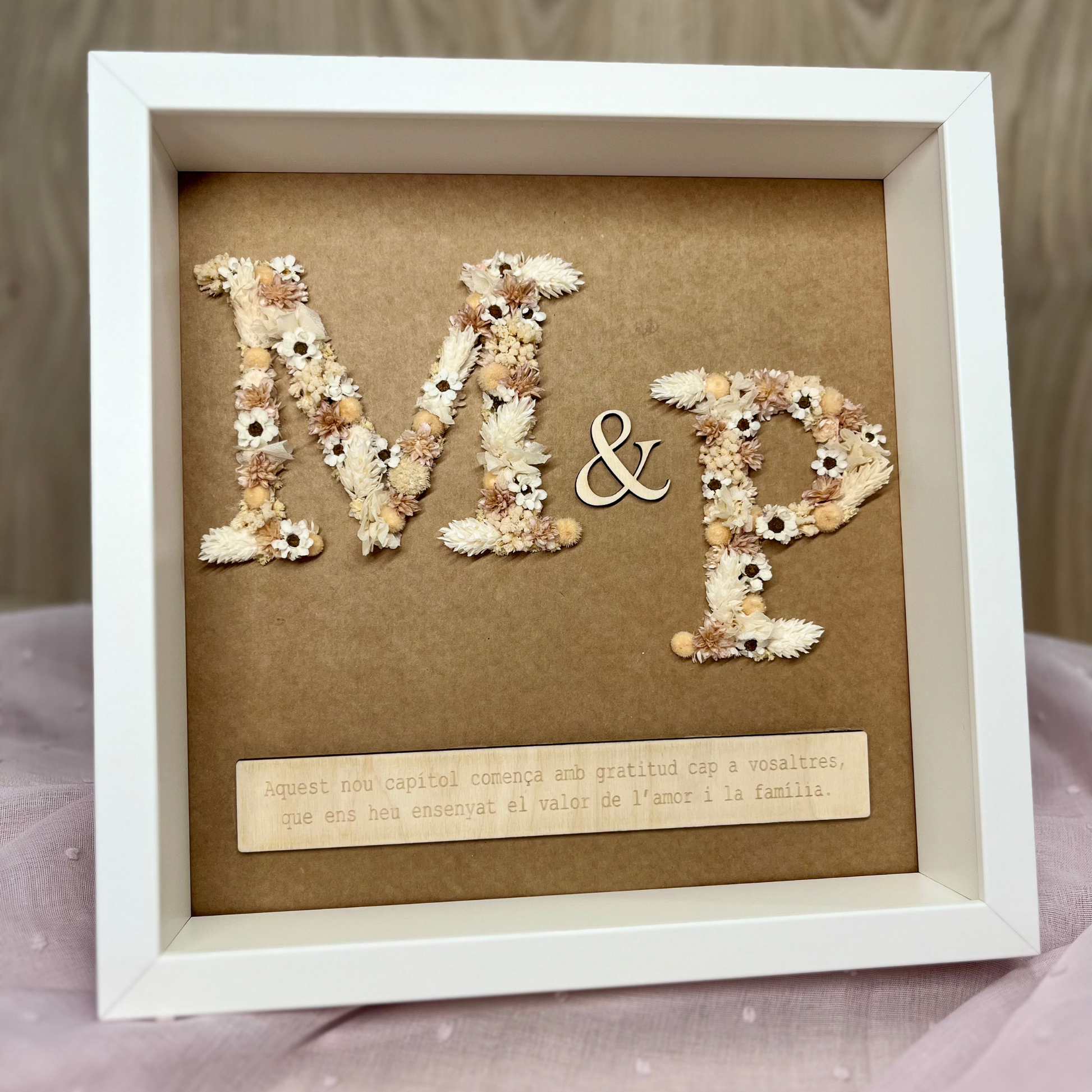 - Inicial decorada con flores preservadas seleccionadas una a una para conseguir un diseño equilibrado, elegante y duradero.