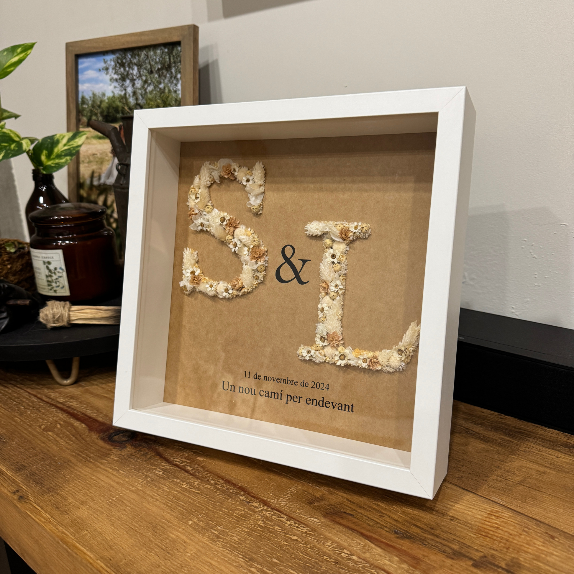 Nuestros marcos con iniciales de flores preservadas son la combinación perfecta entre decoración natural y dedicación. Cada letra se elabora a mano con una cuidadosa selección de flores preservadas, que mantienen su belleza y color durante años sin necesidad de cuidados.