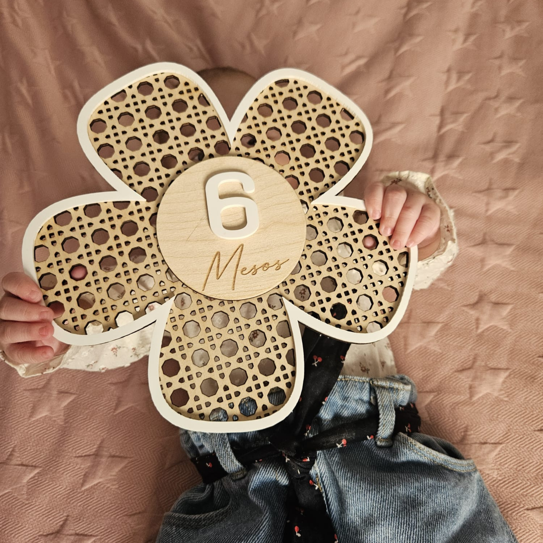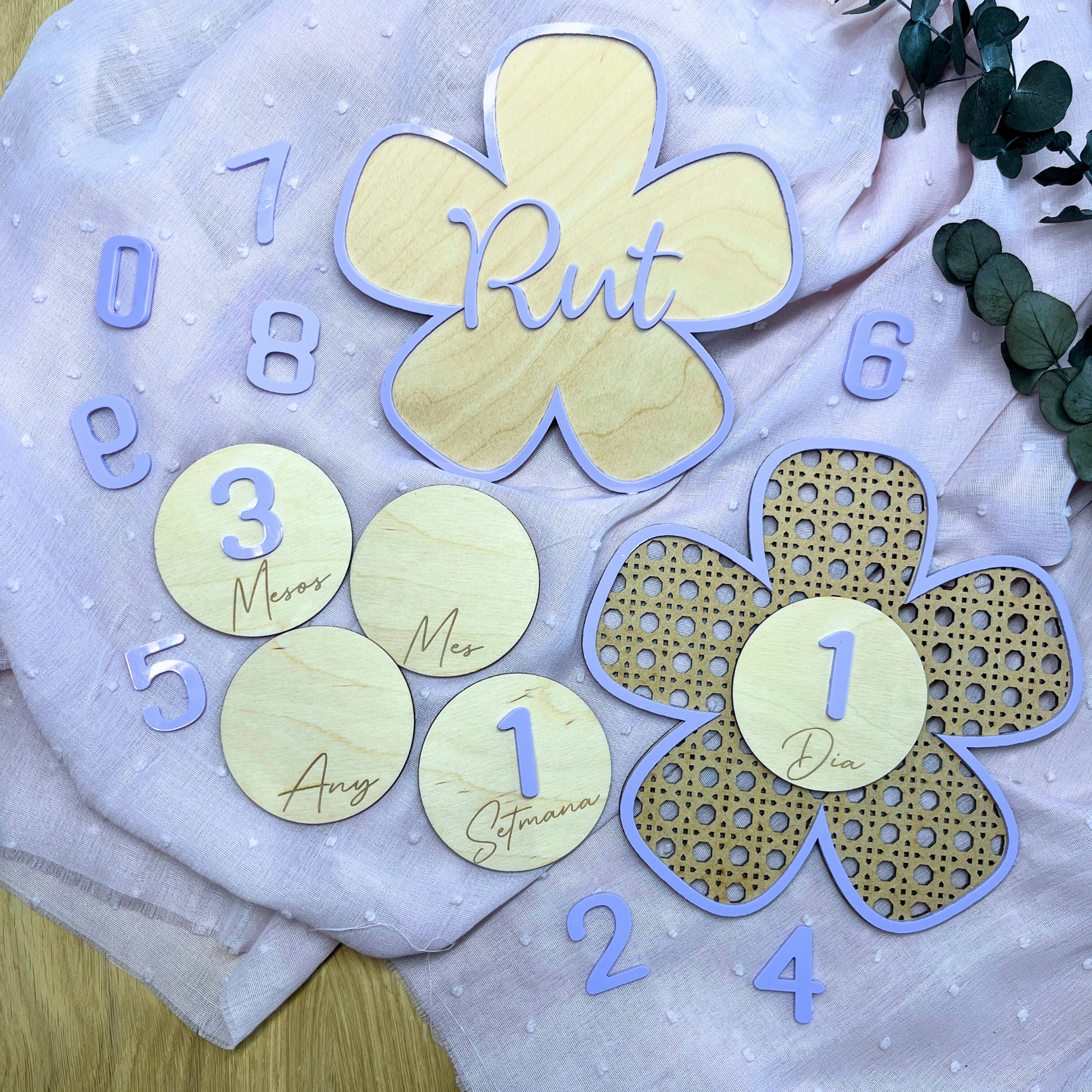 Nuestro Cumple Mes Flor de Ratán combina la calidez de la madera con un diseño inspirado en fibras naturales. La base imita el tejido de ratán, creando un efecto precioso y muy decorativo. Todo el conjunto está pensado para que cada fotografía mensual sea especial, delicada y llena de encanto.