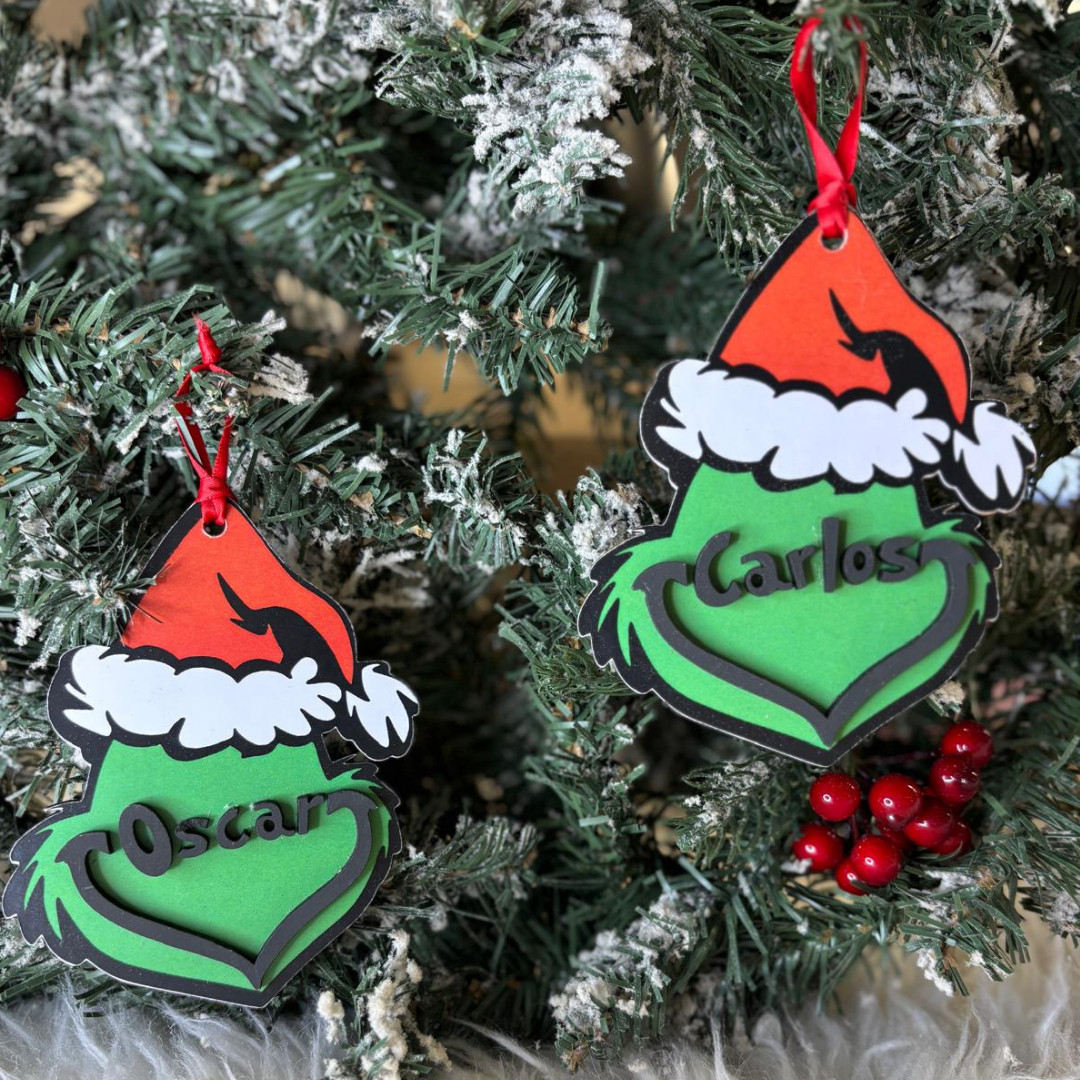 Con base de madera y el diseño del Grinch impreso, incluye el nombre personalizado y la característica sonrisa en relieve, creando un adorno original que no pasará desapercibido en tus fiestas. Cada pieza incluye una cuerdecita para colgar, convirtiéndose en un adorno elegante y lleno de significado. Medidas: 11cm altura aprox.
