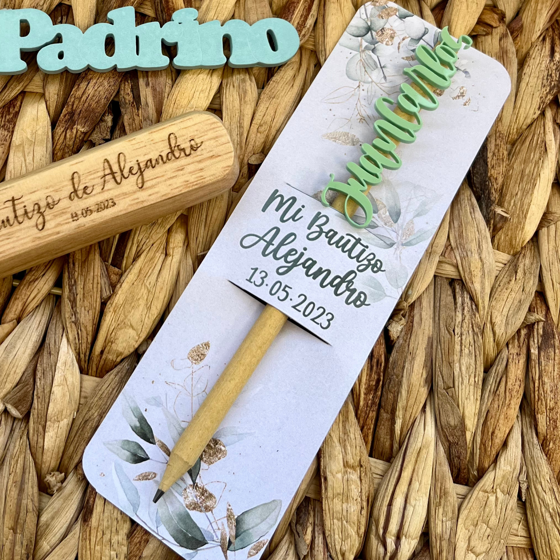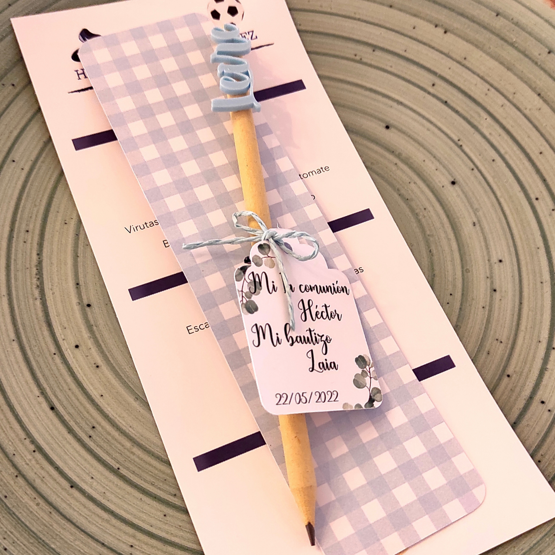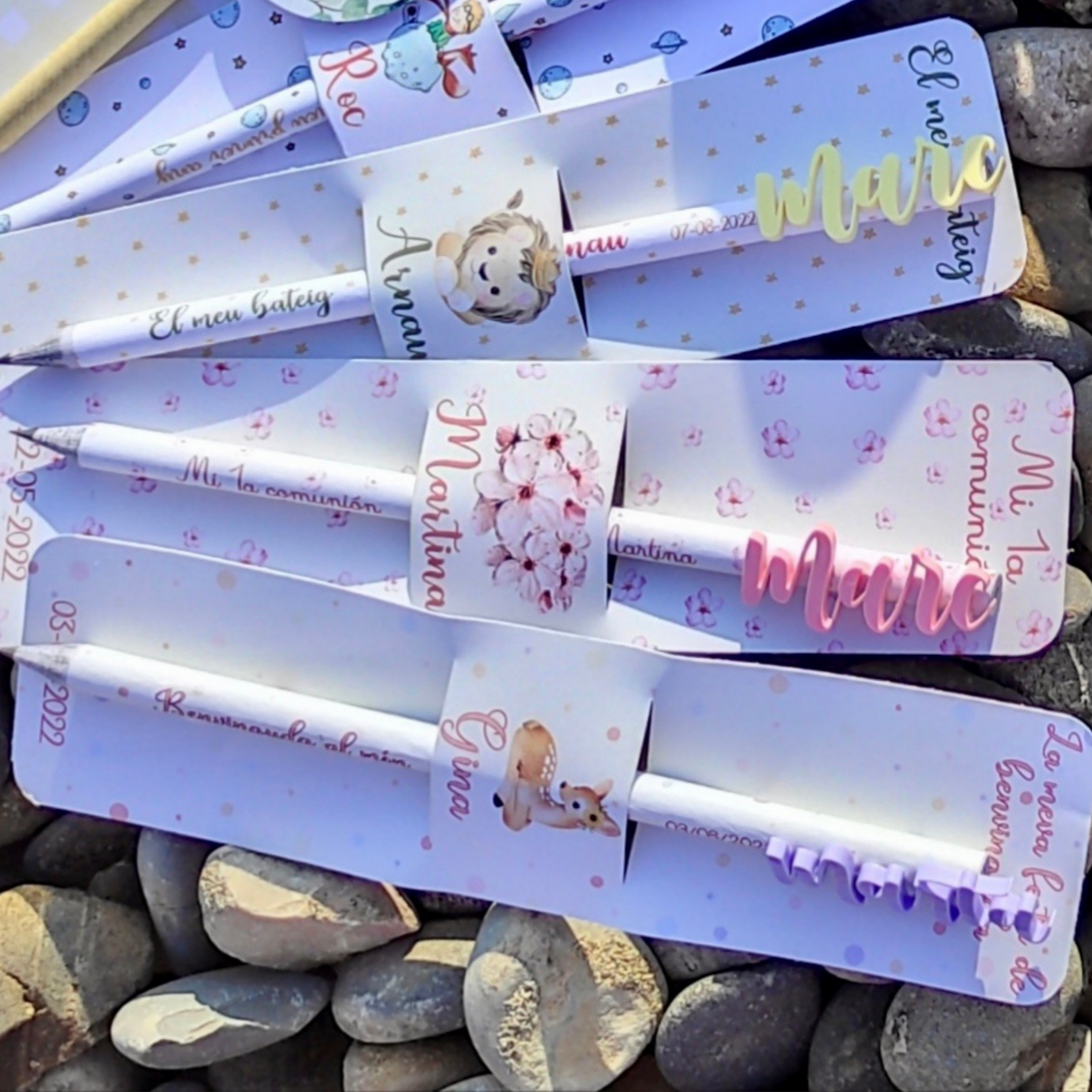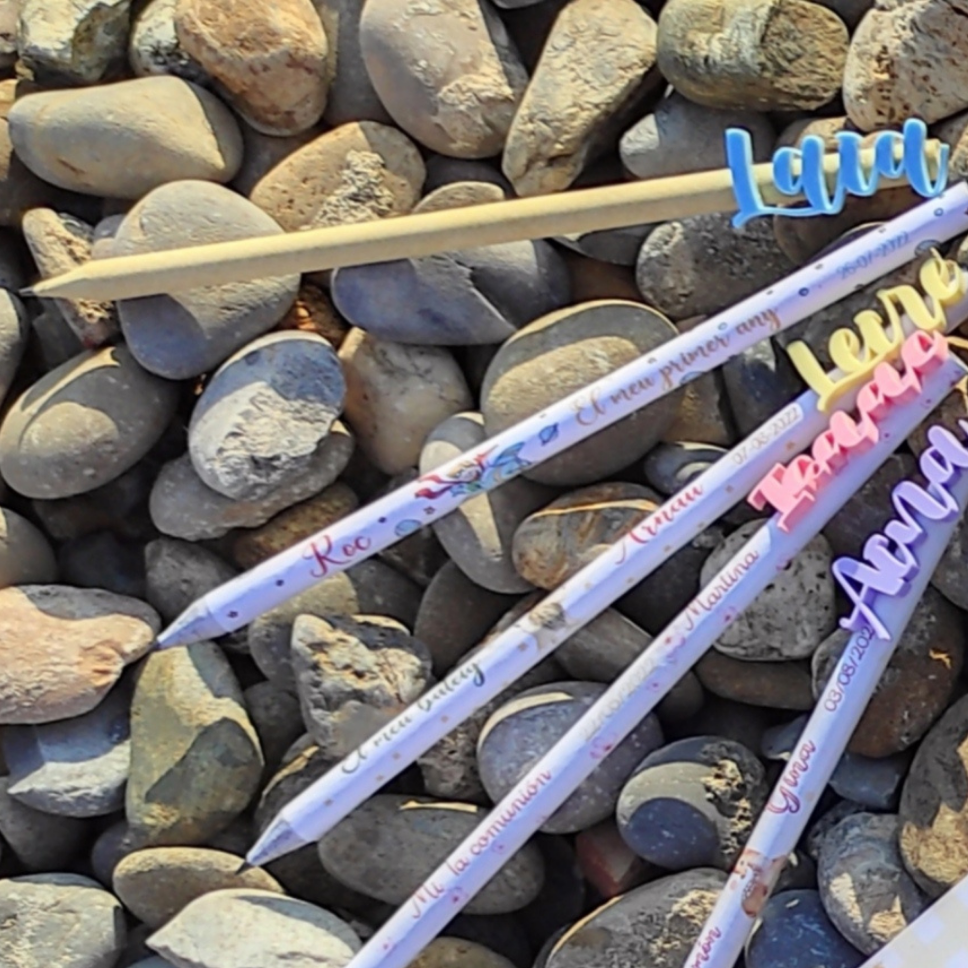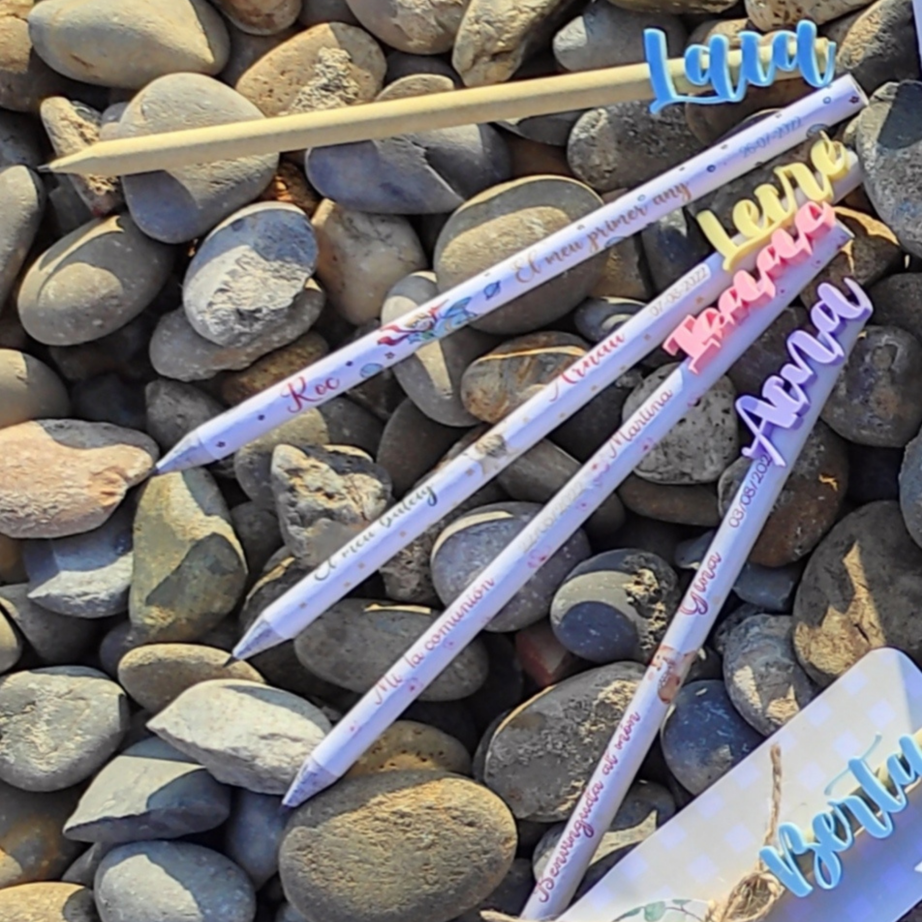 - Nombre en metacrilato: cada lápiz puede llevar el nombre del niño o niña en metacrilato, creando un recuerdo único y especial.